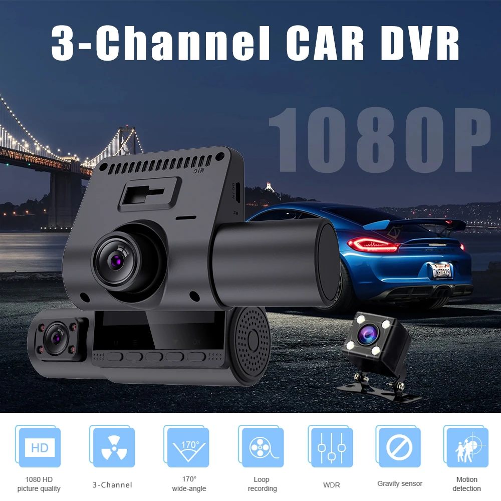 3 Channel Car DVR HD 1080P 3-Len Inside Vehicle Dash Cam Three Way Camera DVRs Recorder Video Registrator Mini Dashcam Camcorder