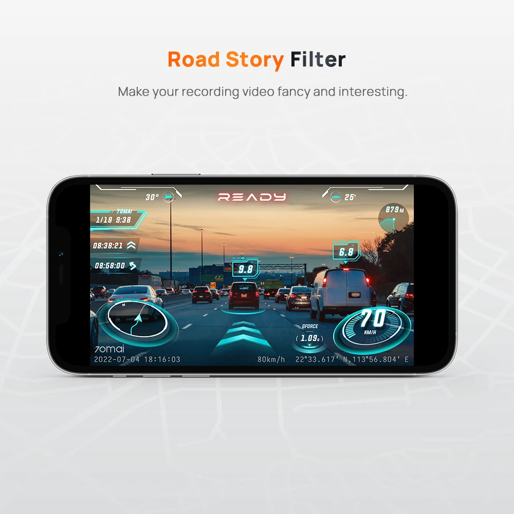 The RS merges live footage with speed, driving direction, real-time altitude and more with Hi-Tech sense effects. And you can post your one-minute long fancy video on your social media.