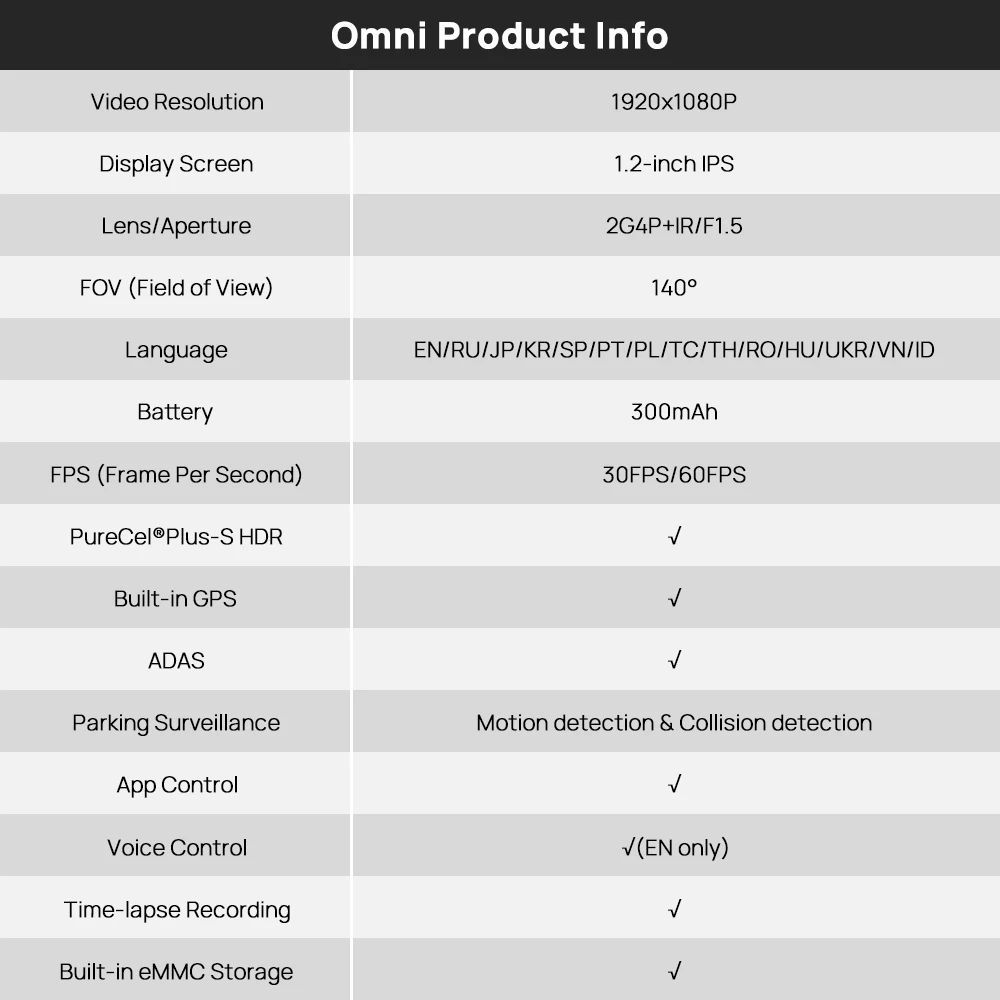A 340° swivel design plus a 140° FOV are stepping up to a 360° no blind spot full view with minimized distortion. The Omni dash cam delivers best in-class night performance givens its F1.5 large aperature and PureCel®Plus-S HDR technology. Equipped with AI motion detection and collision detection, it is designed to precisely capture any suspiciousness around the vehicle, significantly maximize surveillance capability. The upgraded ADAS also helps you more intelligently avoid road safety-related accidents.