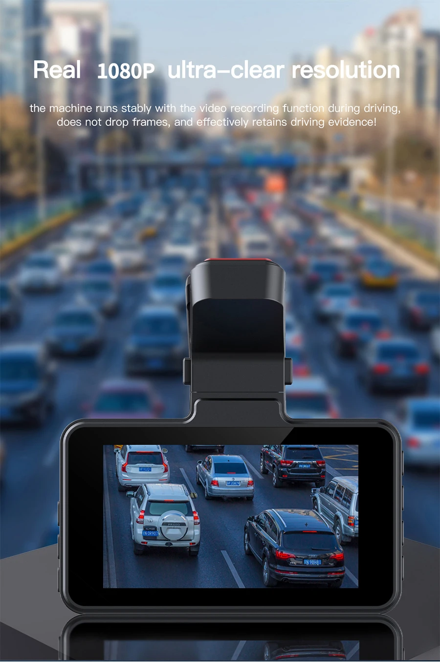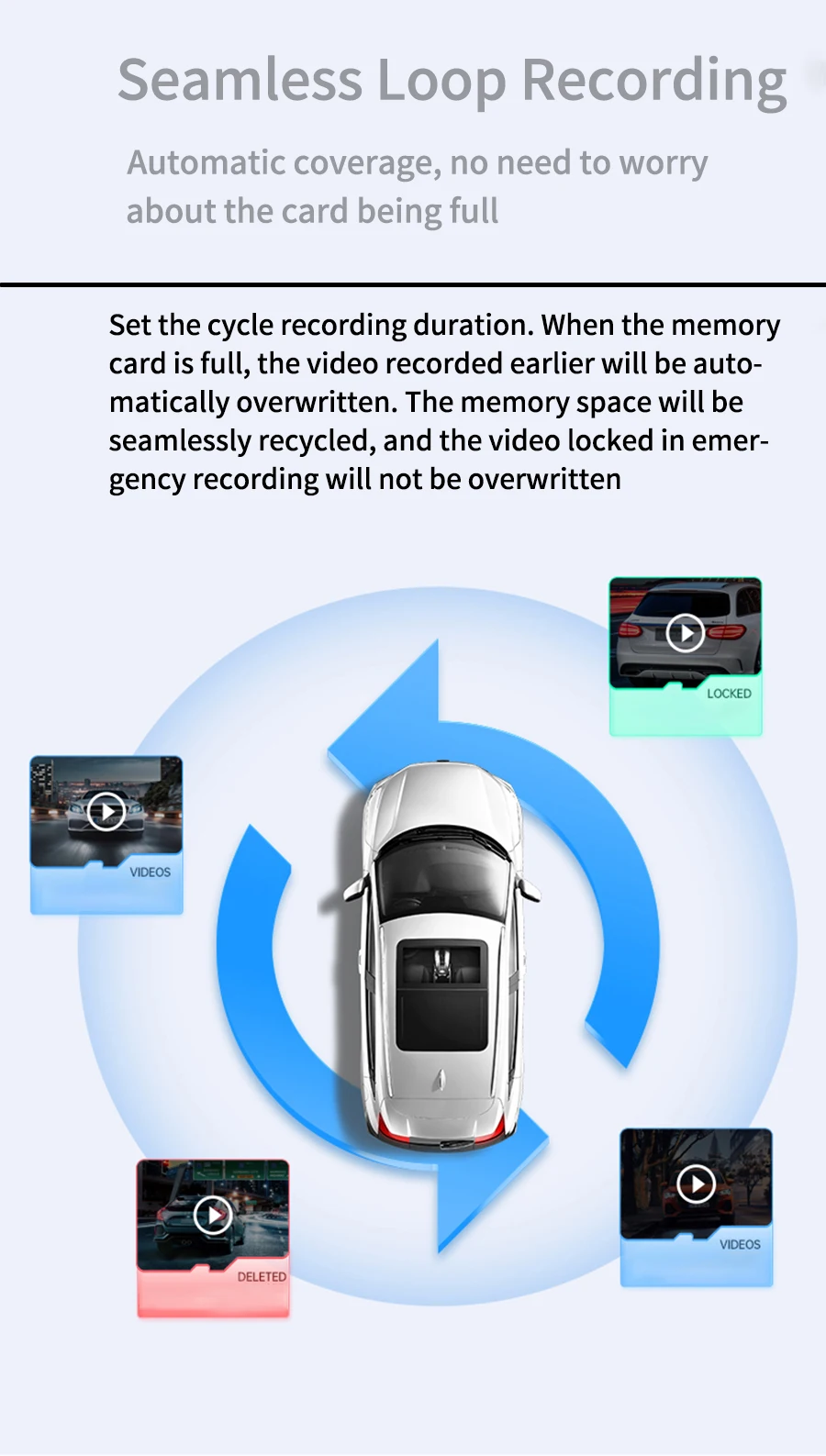 Capture every detail with a high-resolution 1296P front camera and a wide 170° viewing angle. Perfect for recording traffic incidents, scenic routes, or unexpected events. Videos are saved automatically in a continuous loop on a Class 10 memory card (up to 64GB).