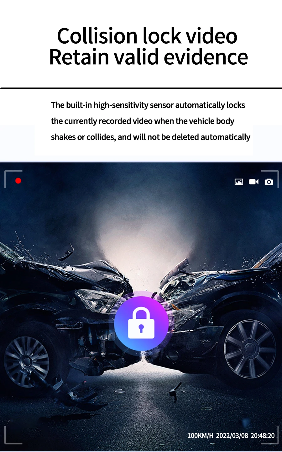 The integrated GPS module logs your driving route, speed, and direction with pinpoint accuracy. Perfect for reviewing journeys or providing evidence after an accident. The dash cam also automatically records and locks a 20-second clip when an impact is detected.